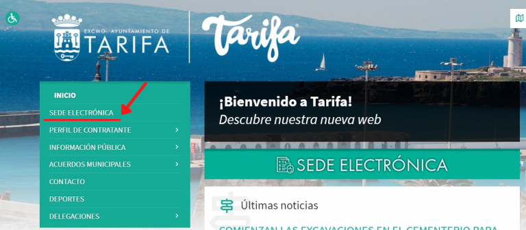 • Acede a la web oficial del ayuntamiento de Tarifa aytotarifa.com y haz click en el apartado “SEDE ELECTRÓNICA”
